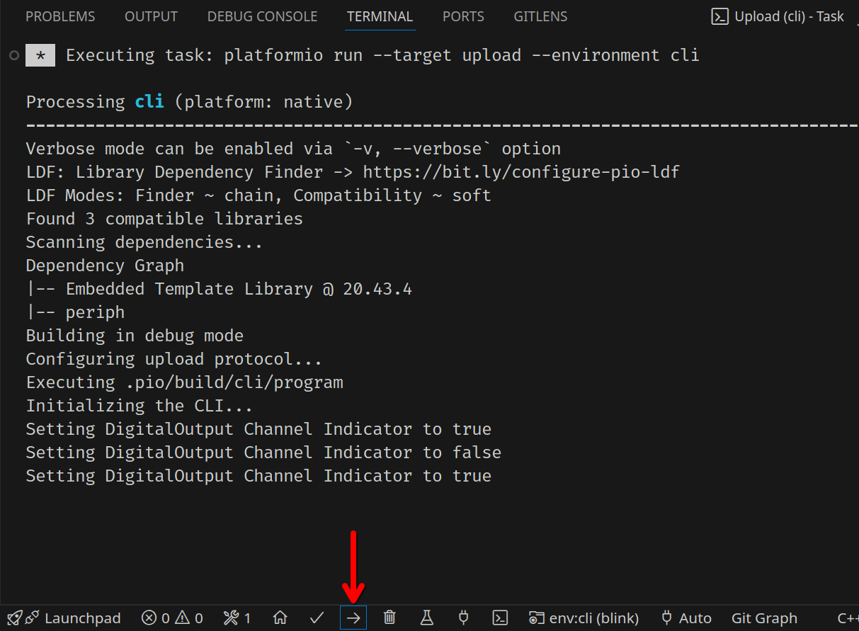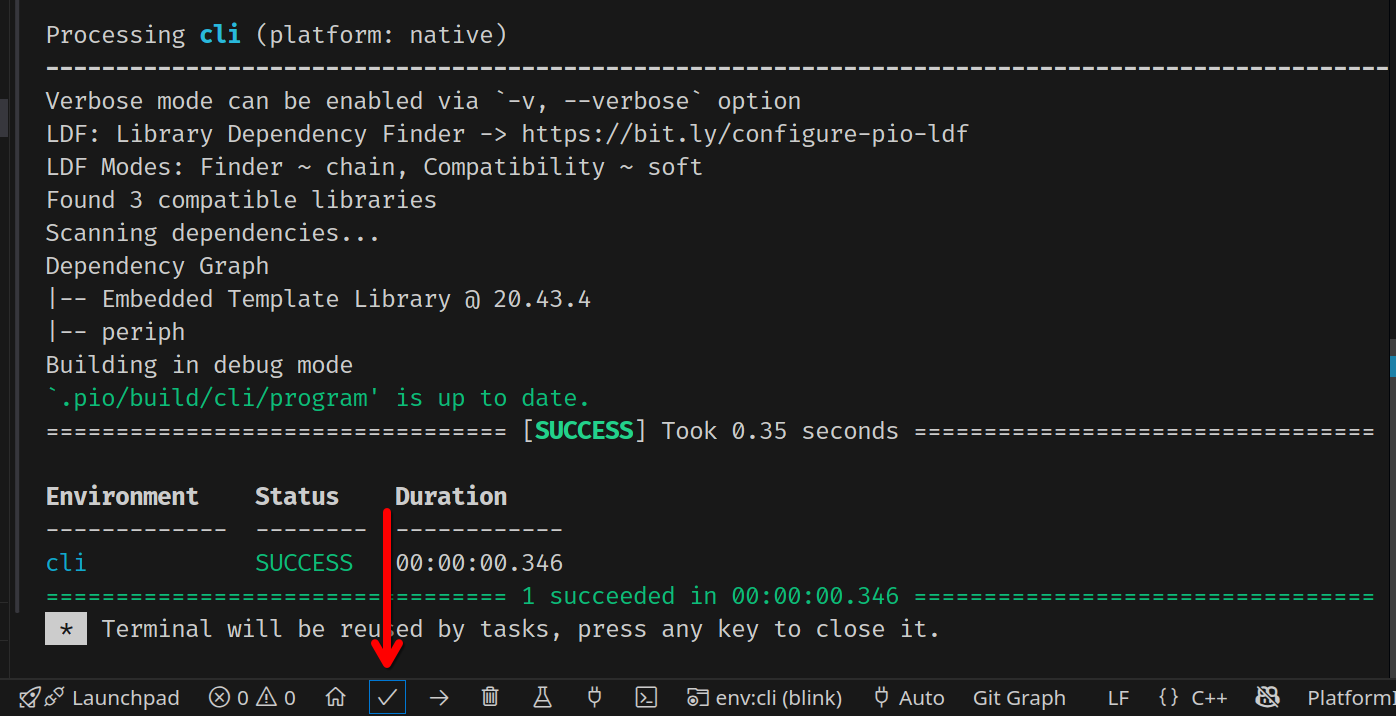 Click the Build button to build / compile the project. PlatformIO will open a window and display progress and any errors.