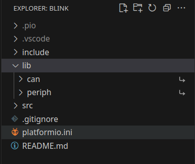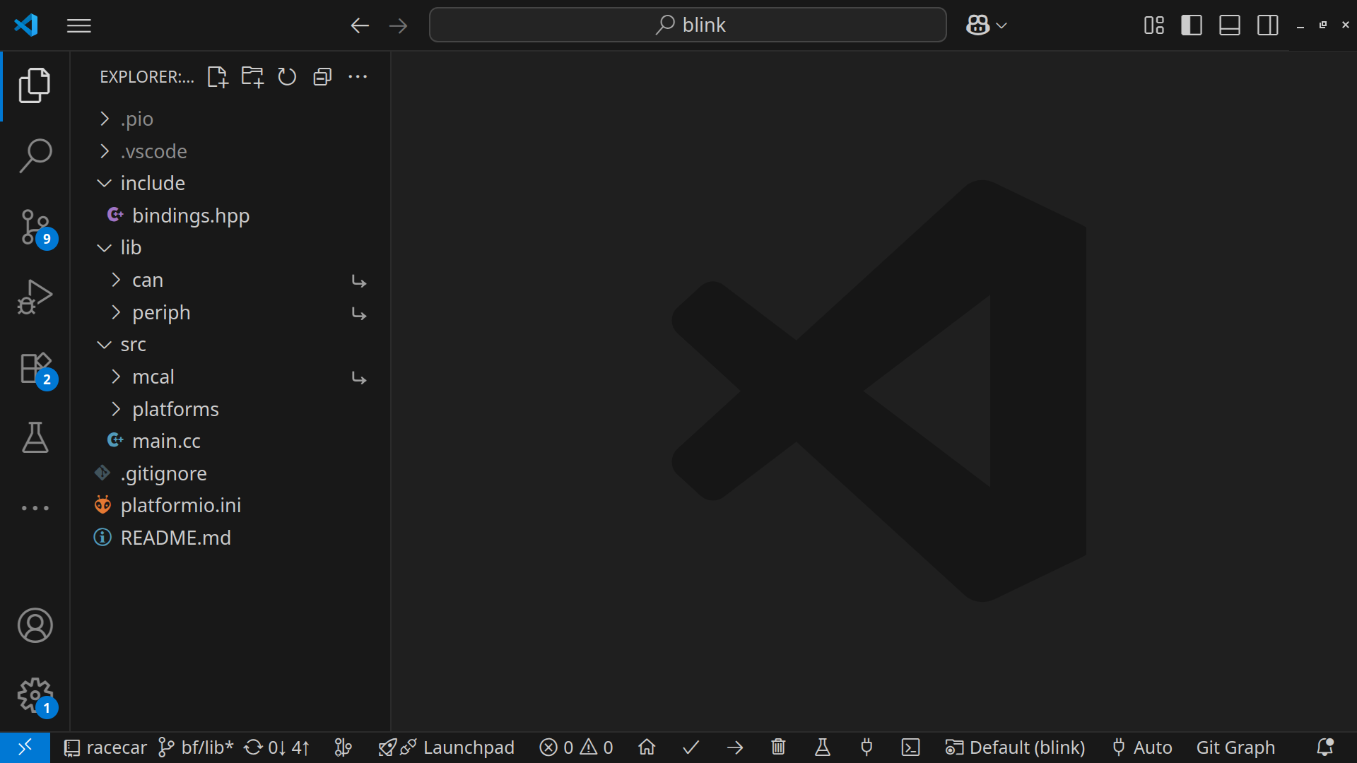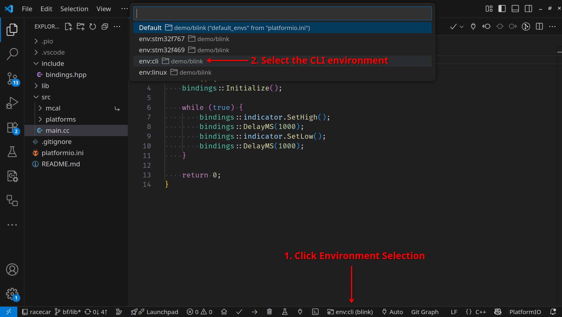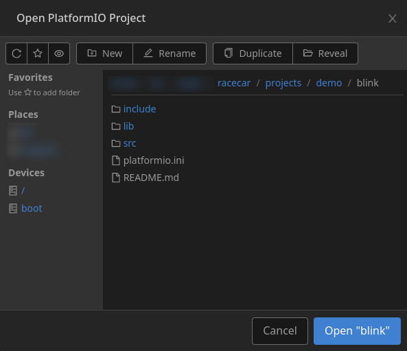 From PlatformIO Home, click Open Project and open racecar/projects/demo/blink