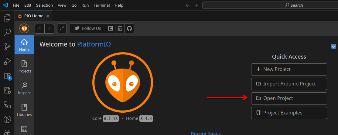 Open a new VS Code window. Go to the Platform IO homepage by clicking the icon in the Status Bar.